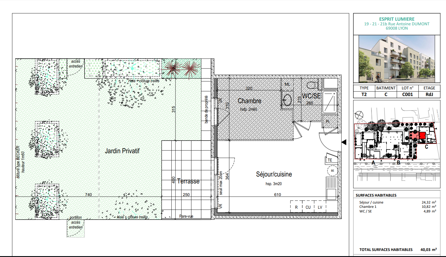 Rue Miriam Makeba, beau T2 de 40.03m², au rez-de-chaussée. Il se compose d'une entrée, ouvrant sur un séjour avec cuisine ouverte semi équipée et donnant accès à une terrasse de 10m² et un jardin de 70,69 m² , une chambre, une salle d'eau et un wc. Garage en sous-sol. Plafond Pinel.