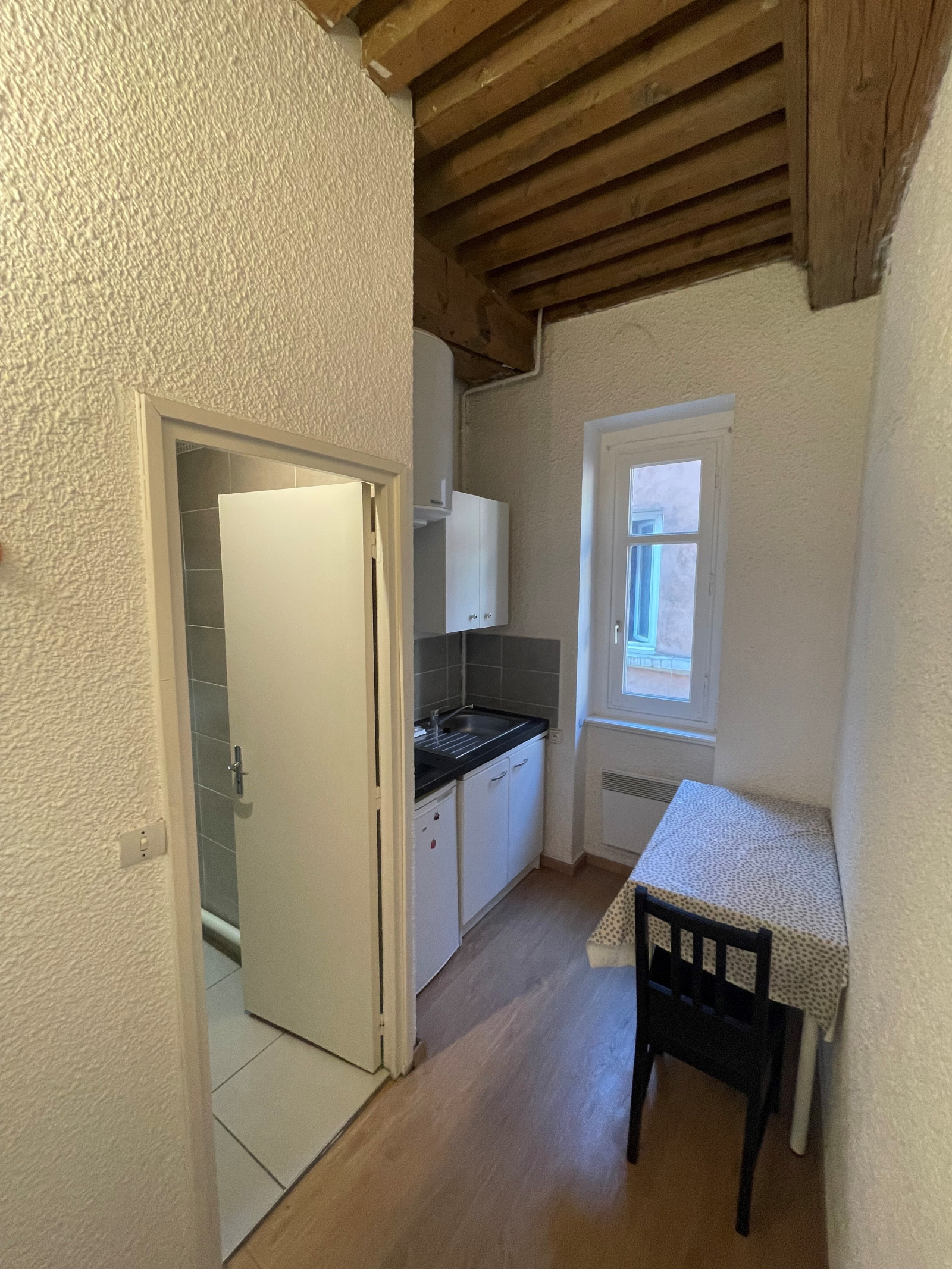 Rue Valfenière, dans un immeuble ancien, studio entièrement meublé au 4ème étage de 21.16m², comprenant une entrée, un beau séjour avec mezzanine donnant accès à une cuisine ouverte équipée, une salle de douche avec machine à laver et des toilettes. Climatisation reversible avec double vitrage. Calme, proche des transports , écoles et commerces.