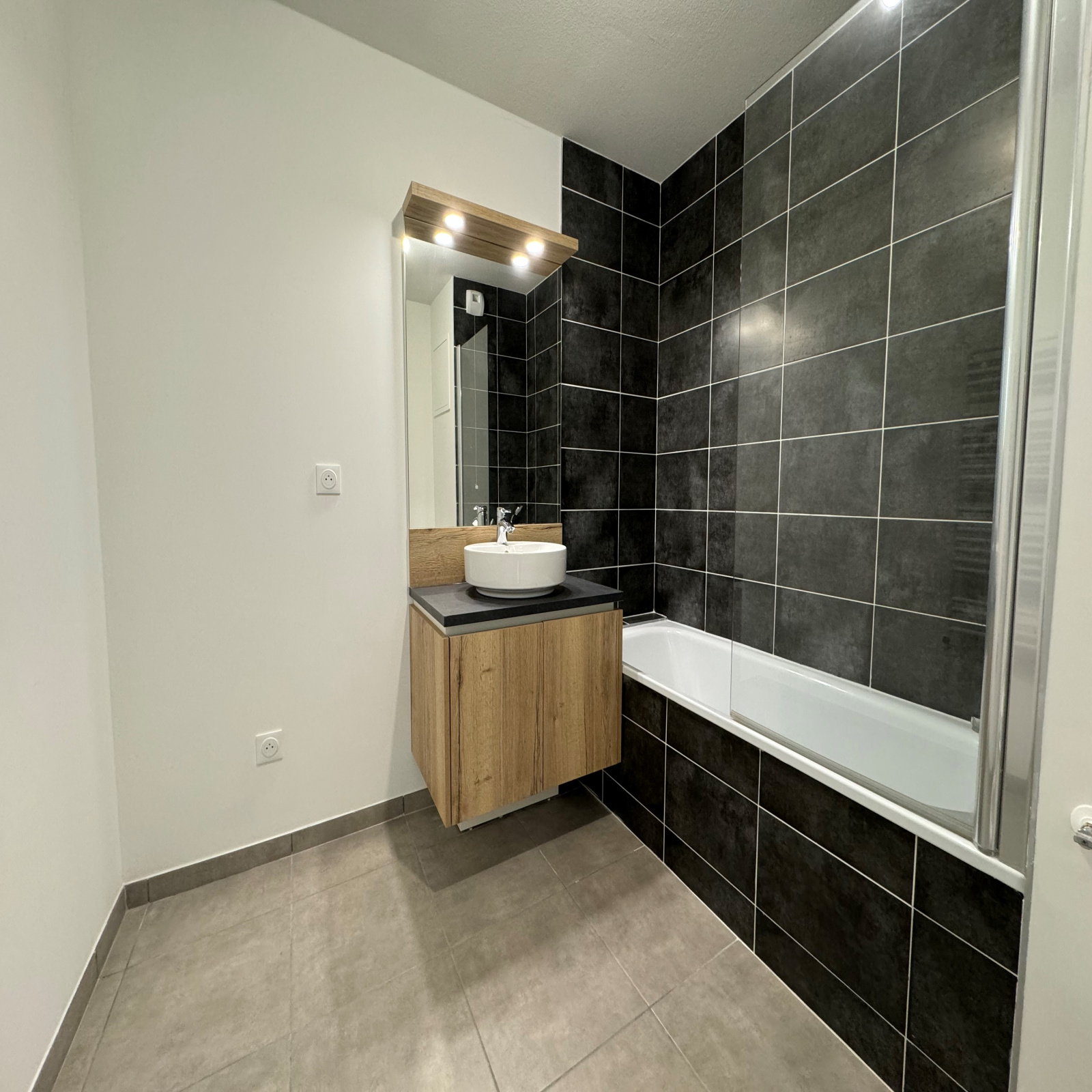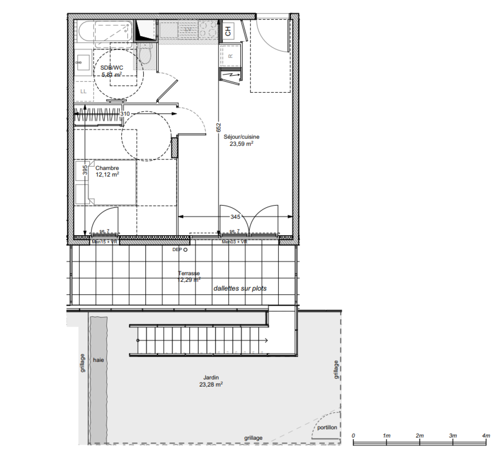 Chemin du pont des Biches, dans un programme neuf au rez-de-chaussée, beau T2 de 41.52m² comprenant une entrée, un séjour avec une cuisine ouverte semi équipée, donnant accès à une terrasse balcon de 12.29m², ainsi qu'un jardin de 23.28m² un coin nuit avec une chambre, une salle de bain avec un wc. L'appartement dispose d'un garage. Plafond Pinel.