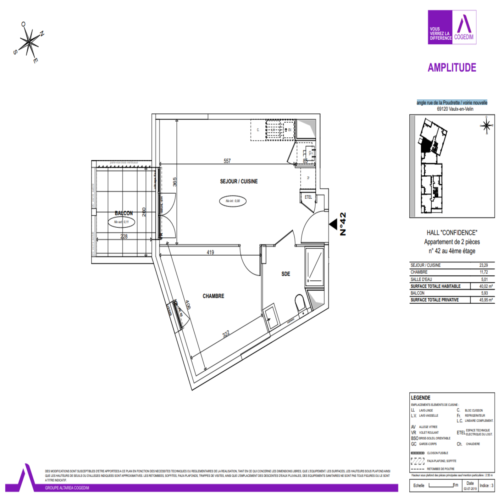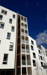 Rue Suzanne Buisson, appartement T2 de 40m², au 4ème étage, comprenant un séjour, une cuisine ouverte équipée, une chambre, une salle d'eau et des WC. L'appartement offre un balcon de 5.93 m² et dispose d'un garage en sous-sol.
