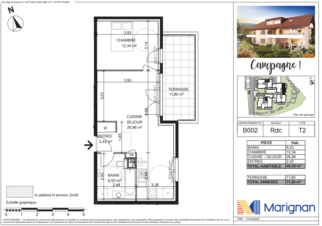 Chemin de la Fontaine, au rez-de-chaussée beau T2 de 48.25m² comprenant une entrée, un séjour avec une cuisine ouverte équipée (plaques,four) ouvrant sur une terrasse de 11.80m², une chambre avec accès à la terrasse également, une salle de bain et des toilettes. L'appartement dispose d'une place de parking en sous-sol, d'une deuxième en extérieure et d'une cave. Plafond PINEL