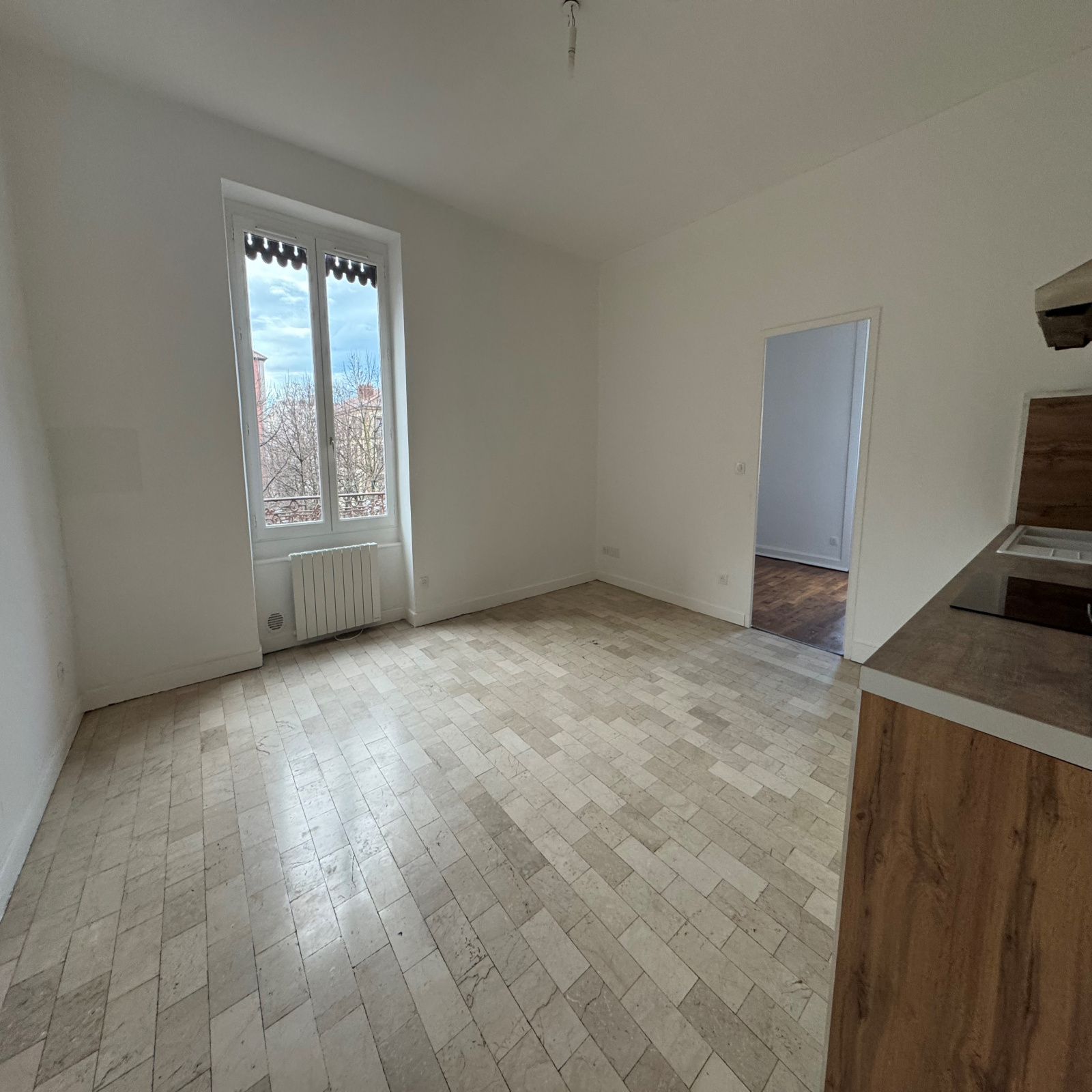 Charpennes, rue d'inkermann, dans un immeuble ancien, appartement rénové comprenant une entrée, un séjour avec une cuisine équipée, une chambre, une salle de bains et des toilettes. Calme, proche transport, écoles et commerces.