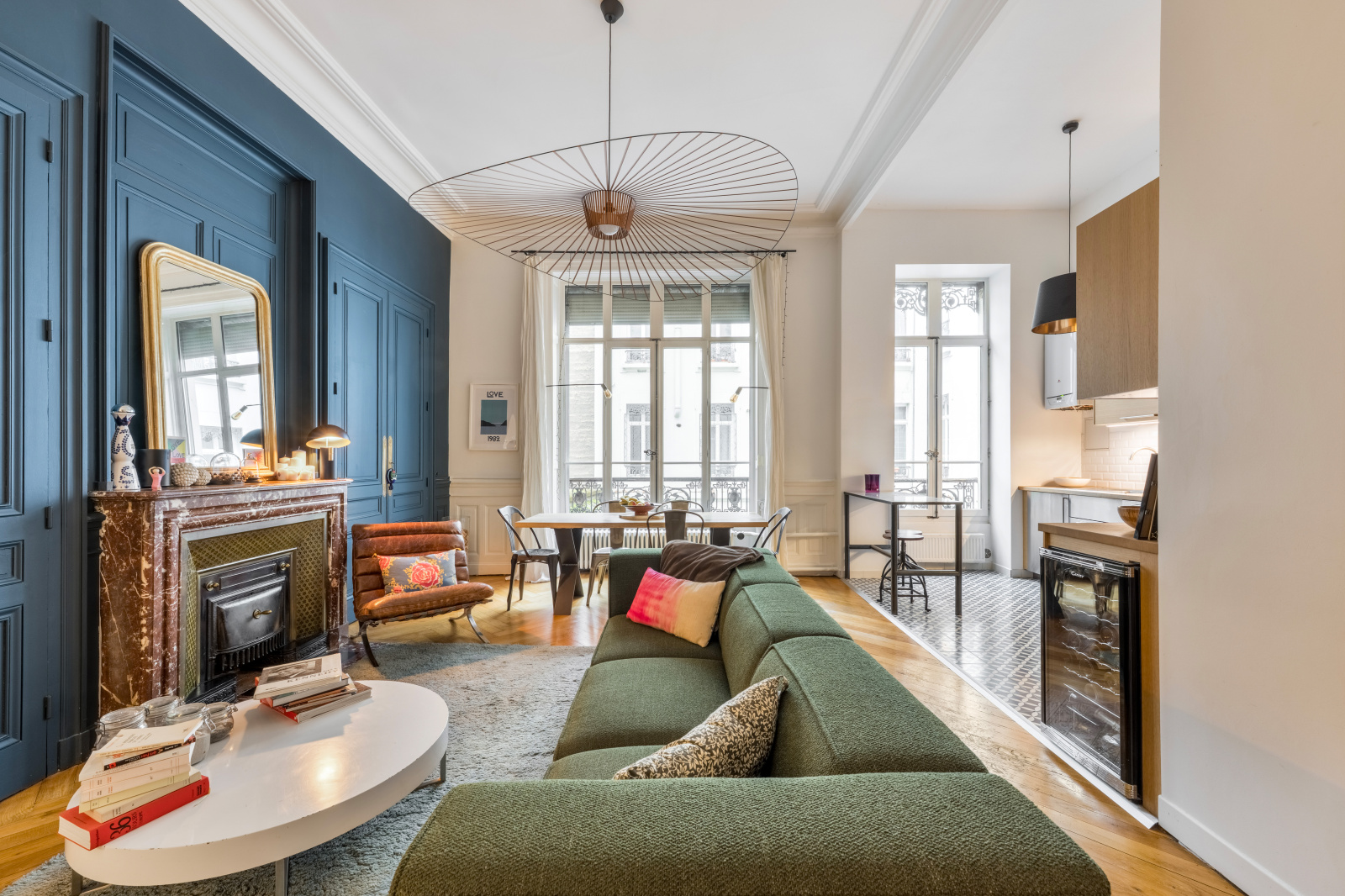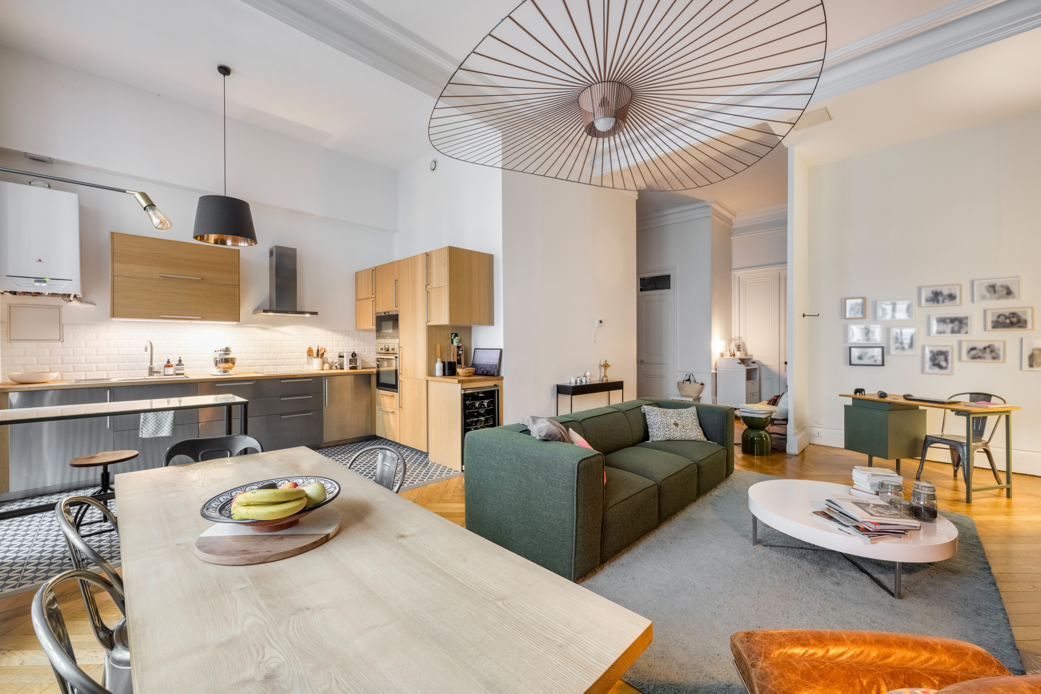 Au pied de la place Puvis de Chavanne, très bel appartement de 118m² rénové comprenant une vaste entrée desservant une belle pièce de vie de 46m² ouvrant sur une cuisine entièrement équipée, une grande chambre parentale de 22m² avec alcôve, une salle de bains, un wc indépendant, et une baunderie. Une partie nuit enfants complète l'ensemble avec 2 chambres (15m² et 13m²) avec une salle de douche. Traversant, cet appartement dispose également d'une cave. Immeuble en copropriété composé de 5 lots. DPE 205 (D) GES 43 (D). Honoraires à la charge des vendeurs.
